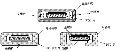 恒温加热PTC热敏电阻可制作成多种外形结构和不同规格, 常见的有圆片形、长方形、长条形 、圆环以及蜂窝多孔状等。把上述PTC发热元件和金属构件进行组合可以形成各种形式的大功率PTC加热器。